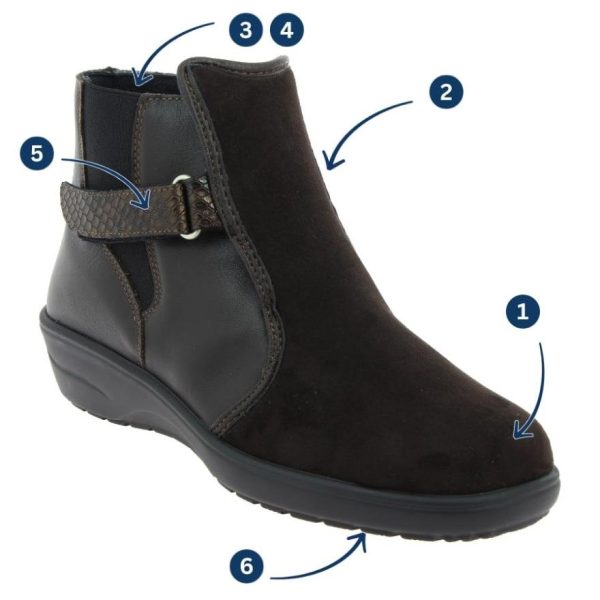 Découvrez la bottine orthopédique Syrielle, une solution conçue spécifiquement pour répondre à vos besoins de confort et de soulagement de la douleur. Si vous souffrez de pathologies telles que l’hallux valgus, le quintus varus, les orteils en griffe ou en marteau, les œdèmes, la fasciite plantaire ou le névrome de Morton, la bottine Syrielle est votre alliée incontournable. Syrielle est la bottine qui prend soin de vos pieds. Elle arbore un avant-pied entièrement extensible et déperlant, créé pour s’adapter aux orteils déformés. L’enfilage est facilité par une fermeture à glissière longue, simplifiant ainsi vos mouvements au quotidien. Lorsque la chaleur est nécessaire, la doublure chaude de la bottine Syrielle vous offre une sensation de confort et de bien-être, même pendant les journées les plus fraîches. Elle ajoute une couche de chaleur douillette à chaque pas. L’intérieur de la bottine est tout aussi personnalisable. La semelle intérieure et l’intercalaire sont amovibles, ce qui vous permet d’ajuster la chaussure au volume de votre pied ou de la remplacer par une semelle orthopédique sur mesure, pour un confort optimal. L’élastique de la bottine offre aisance et souplesse à chaque mouvement, tandis que la bride réglable assure un maintien sûr et ajusté autour de la cheville. La semelle extérieure WETGRIP®, spécialement conçue pour un usage extérieur, garantit une excellente stabilité même sur sol mouillé, vous permettant ainsi de vous déplacer en toute confiance, quelles que soient les conditions. Si vous cherchez une solution qui apaise vos douleurs de pieds tout en maintenant une démarche confortable, la bottine Syrielle est le choix parfait. Elle allie l’extensibilité de l’avant-pied, la praticité de la fermeture à glissière et la personnalisation du soutien grâce aux éléments amovibles. Optez pour la bottine orthopédique Syrielle et découvrez comment le confort et la fonctionnalité peuvent coexister harmonieusement. Prenez soin de vos pieds sensibles tout en arborant une esthétique urbaine qui vous ressemble.