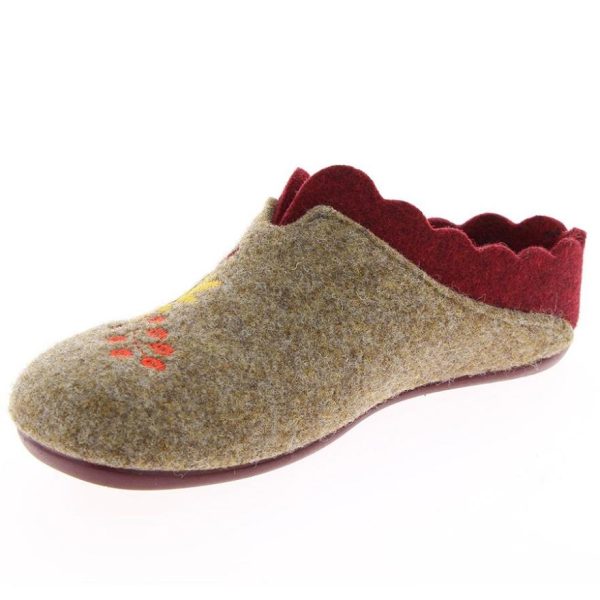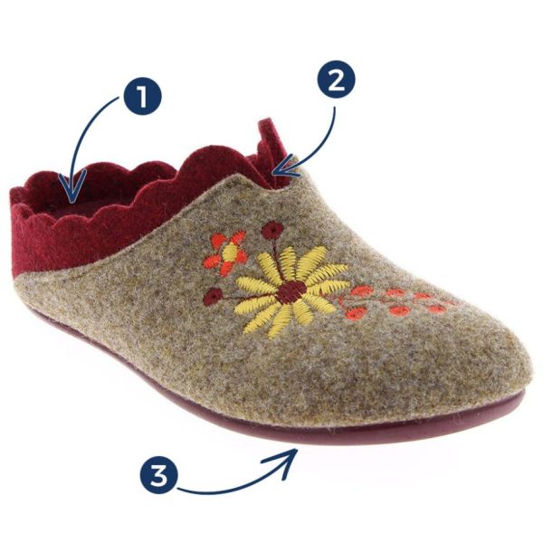 Ce chausson mule LUISA beige en laine bouillie comporte une jolie broderie florale sur l’avant-pied. La semelle intérieur est amovible.