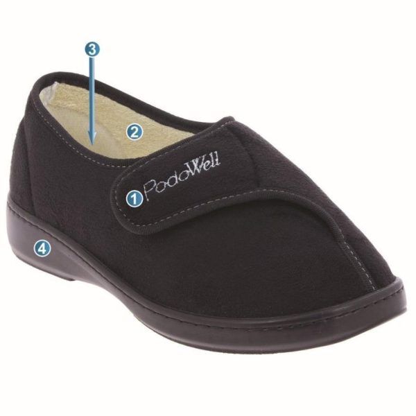 Ce chausson lavable en machine est composé d’une doublure en éponge aussi confortable avec des chaussettes que pieds nus. Le col est bas pour éviter les frottementss au niveau des malléoles. Il est facile à enfiler grâce à sa bride auto-agrippante qui permet un réglage optimal ainsi qu’un excellent maintien du pied. La semelle est légère, souple et stable et la première de confort peut être remplacée par une semelle sur mesure.