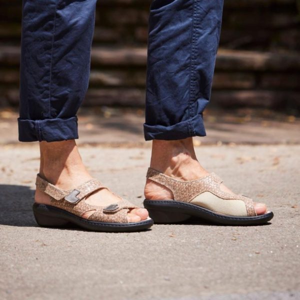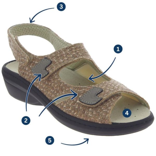 Découvrez la sandale Dina02 en coloris sable, en cuir écaille alliant souplesse et praticité. Cette sandale est dotée de 3 brides auto-agrippantes pour un chaussage facile, un réglage précis et un maintien optimal. La sandale possède un tissu au niveau latérale intérieur très souple et extensible pour éviter les frottements et protèger la zone. La semelle est légère et est constituée de 2 zones antidérapantes pour assurer stabilité lors de la marche, sans freiner le pied. L’assemblage de la semelle avec le dessus est renforcer par une couture pour plus de résistance. Cette sandale est adaptée aux personnes atteints de déformations de l’avant du pied, de pieds larges et de porteurs de semelles sur mesure.